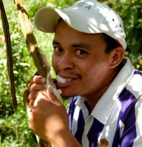 Daniel Reyes, Demo Farm foreman, shows why Inga is sometime known as the candy floss tree! Children especially love this natural sugary snack, making