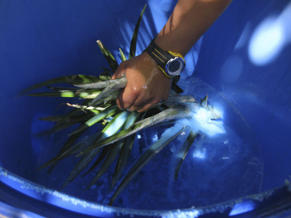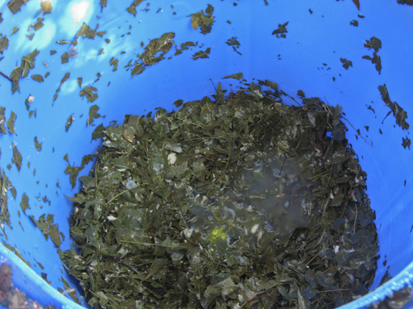 The organic insecticide we made consisted of crushed neem leaves and crushed garlic diluted with water. Neem (Azadirachta indica) provides a remarkable organic insecticide which is affective against a several hundred different insect species. As most insects have to consume neem in order to be effected by it, neem generally leaves unharmed beneficial insects such as honey bees and spiders while targeting most herbivorous pest species. Plus, as the chemical structure of neem is so complex, scientists predict it will take a long time for pests to evolve any resistance against it. Garlic is also a useful ingredient in organic agriculture as it is strong repellent to a number of insect species. Other strong flavours like chili, lemon and basil can also serve as effective repellents against many insect pests and we hope to try these out in the near future.