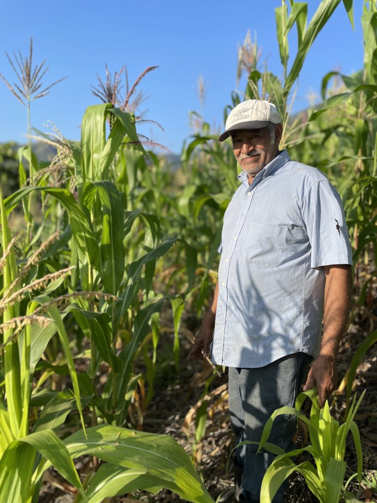 On the left: Don Manuel, in Los Limpios standing next to his successful maize crop using the Inga system. This is after two months of drought, the maize drawing all its water from beneath the inga mulch.