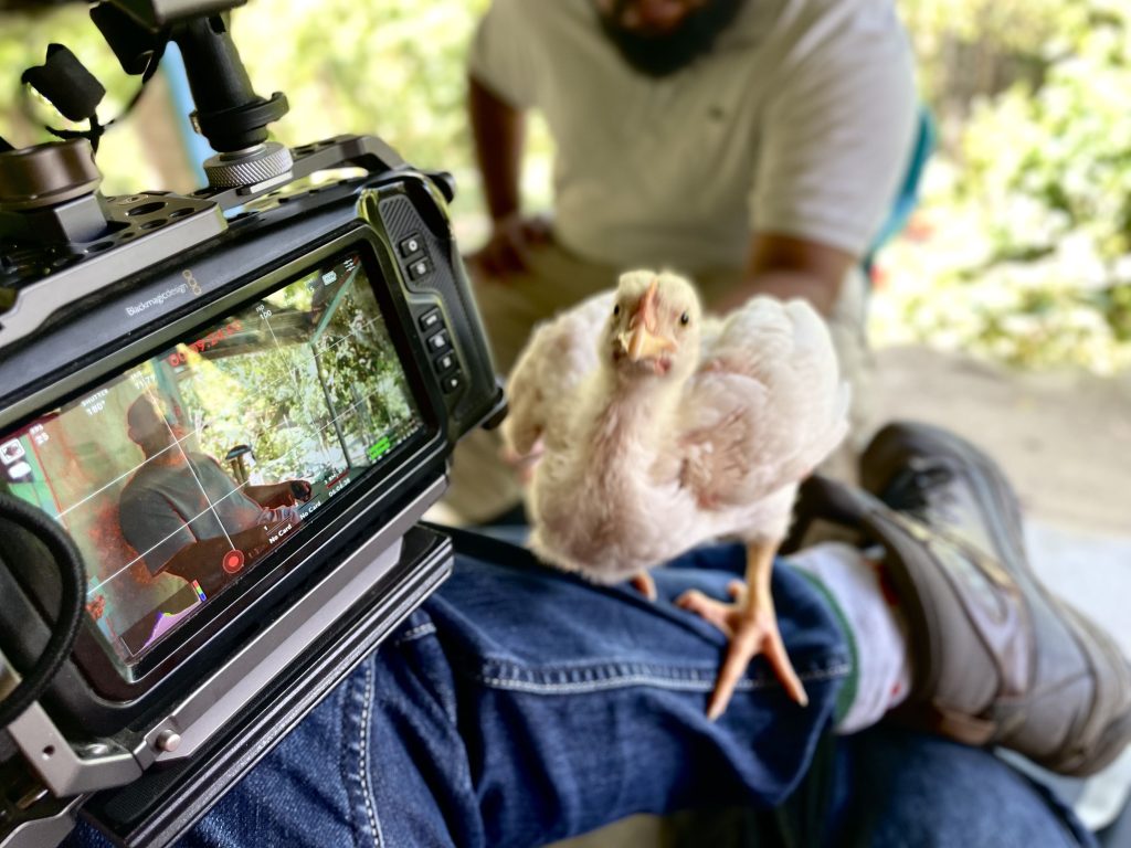 This chicken took a real liking to me during an interview. It got into the camera bag and was climbing all over me – so I got someone to pass me my phone to capture him, looking at me looking at him.