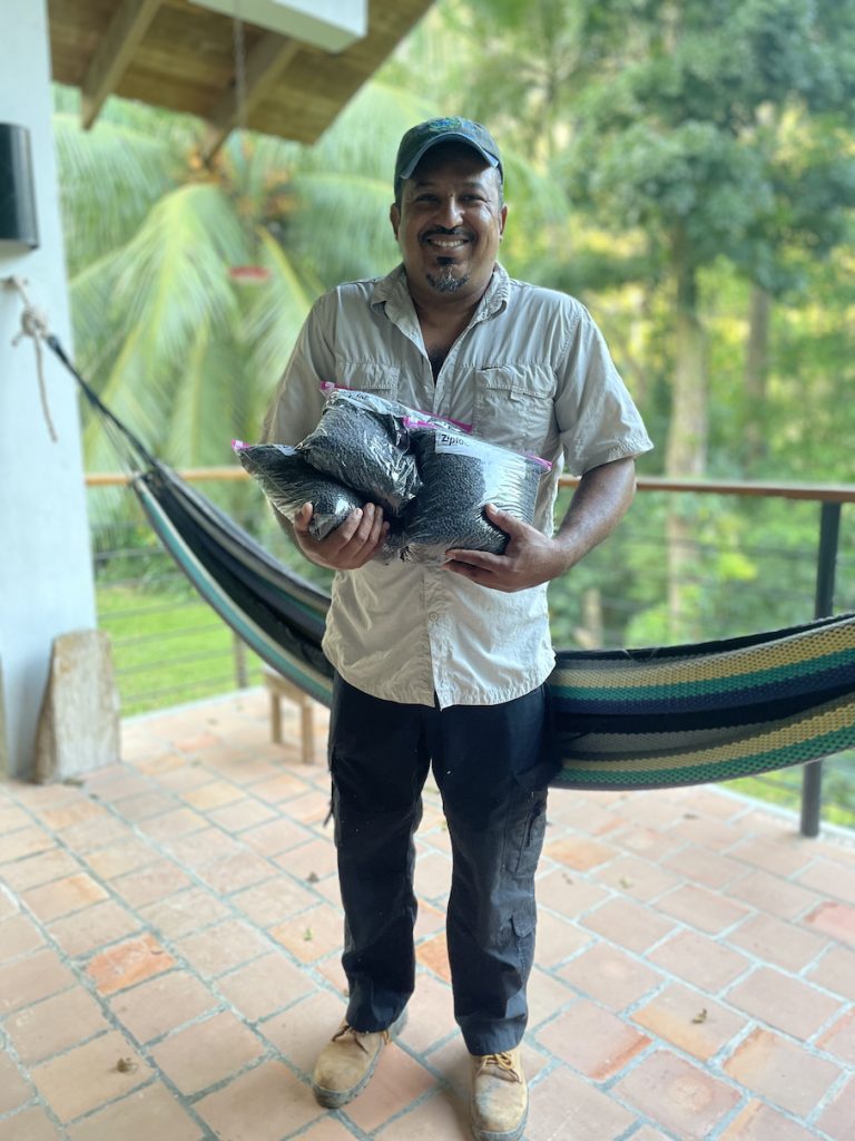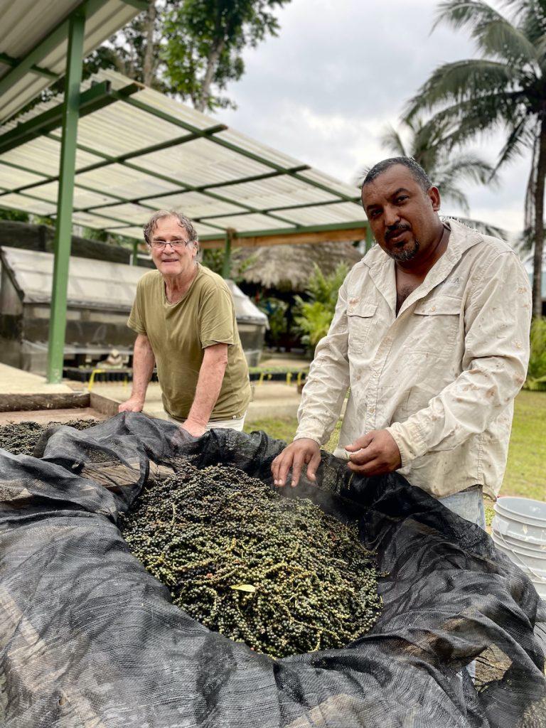 Above (middle) is Inga Foundation’s Director Mike Hands with Abraham Martinez, preparing organic black pepper harvested from just a few mature plants on Inga Foundation’s demonstration farm in the Cuero River catchment alongside Pico Bonito National Park. Pepper vines, grown on ‘tutor trees’ have grown huge, and the farm has well over 30 of them – grown alongside vanilla, cacao and bananas to demonstrate the true variety of crops grown within alley cropping works to visiting farmers, researchers and organisations.