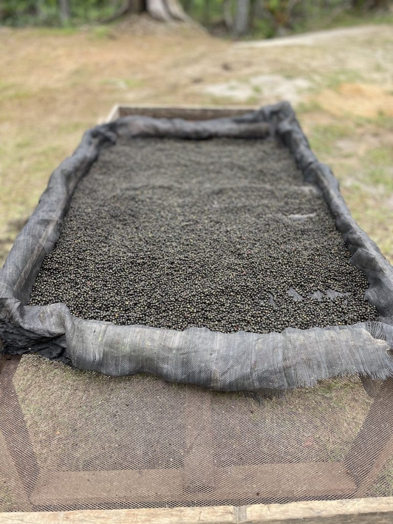 First, the harvested green pepper is placed into a black sack in an enormous cooking pot filled with water. The pepper is cooked for a few minutes at around 80 degrees – not easy to measure over a wood fire! – and this will speed up the drying process. The sack is taken out, the pepper drained, stripped from the stalks and laid out to dry in the sun.
