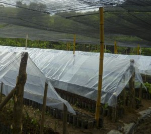 Rainy season has arrived in Honduras, requiring the construction of a little extra protection for the hundreds of pepper cutting in our nursery.