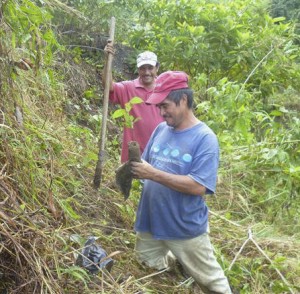 Having finished planting his first plot of Inga alleys, local farmer Martin is now starting on a second. Today Pablo, another Inga farmer from